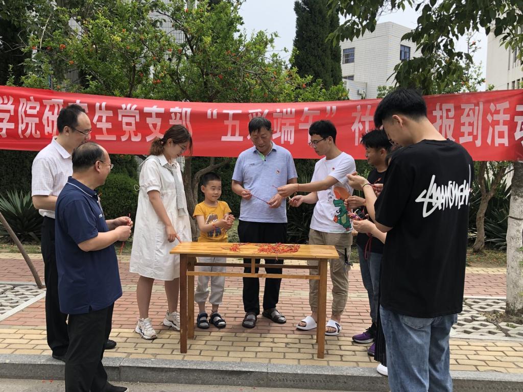 “轻汗微微透碧纨,明朝端午浴芳兰。流香涨腻满晴川,彩线轻缠红玉臂,小符斜挂绿云鬟,佳人相见一千年。”宋代词人苏轼的笔下,就曾出现了端午系五彩绳的习俗。为孩子系五彩绳是端午节的重要习俗,它有祈福纳吉的美好寓意。为了给华润社区的老人和孩子送上祝福,beat365官网于端午期间举行了“五彩端午”社区双报到活动。beat365官网党总支书记唐斌、院长马国清、副院长于涛、组织员勇玲娥以及研究生党支部党员参与了本次活动。