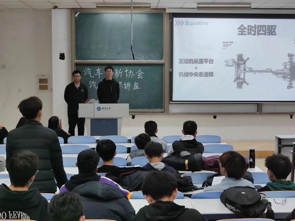 活动伊始,张余泽向与会同学介绍了汽车的传动系统,并深入讲述了传动系统的组成和布置形式是随发动机的类型、安装位置以及汽车用途的不同而变化的。本次讲座沿用边讲解边提问的方式进行。张余泽准备了有关四驱知识的视频,并通过举例说明,介绍了最全面、最著名的四驱方式,即奥迪的Quattro。视频过后进行的有奖问答环节,大家都积极踊跃探讨发言,通过提问与本次会议相关的内容使会议气氛达到高潮,进一步深化同学们对汽车传动系统的了解。至此,第三次汽车知识讲座圆满结束。