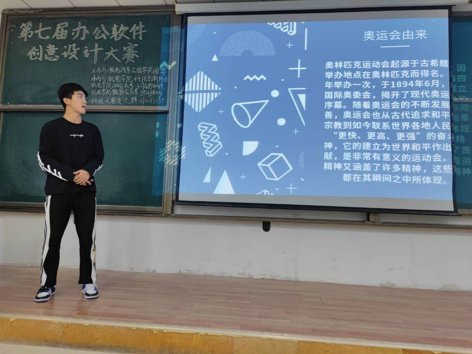 此次竞赛流程分为两部分:办公软件培训和比赛作品答辩。办公软件培训于10月22日在综合楼209室成功举办,三位讲解人分别从Word、Excel和PPT三方面展开讲解。他们对办公软件基础操作和使用技巧的讲解调动了同学们参加比赛的兴趣,点燃了同学们心中创新的火苗。培训结束后,同学们积极组队,并上交报名表。后期比赛作品答辩于综合楼114室举行,参赛同学以“千舟共济大国梦,奥运精神我传承”为主题制作PPT,并按照抽签顺序上台答辩。本次竞赛共有20支队伍参与答辩,评委小组从PPT排版设计、色彩搭配、动画制作、视图使用和答辩人表现等方面对参赛队伍的答辩成果进行评选。经过层层选拔,机213-3班张迪同学带来的PPT作品《传承奥运魂,铸就中国梦》不仅内容详实有趣,而且在形式上运用了各种动画技巧,赢得了评委的一致好评,从参赛作品中脱颖而出,夺得本次竞赛一等奖。经过评委的共同商讨,共评选出一等奖2项、二等奖3项以及三等奖6项。最后,王方正做总结发言,他对大赛的整体表现进行总结与点评并希望同学们能够以此次大赛作为契机,积极参与各项科技创新比赛,丰富自己的课余生活,在浓厚的爱国情怀和强烈的奥运精神的熏陶下,愿同学们怀着搏击长空的渴想,于黑白中耕耘色彩,守正行直,敦品励学,赓续昨日荣耀,待创明朝辉煌。至此,此次办公软件创意设计竞赛圆满落幕。