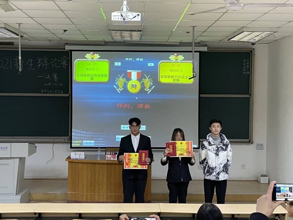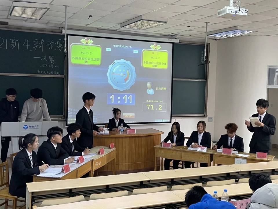 本次比赛分为上、下半区共四场辩论赛。辩题紧贴时代热点和社会现象,积极引导新生树立正确的价值观,辨析生活之理。比赛伊始,赛事主席为参赛选手介绍比赛规则,随即比赛正式开始。在上半区的赛场上,正方以“当前中国人更应该培养民族自豪感”为论点,旁征博引、步步紧逼,反方以“当前中国人更应该培养危机感”为论点,唇枪舌战、互不相让。无形的思想火花在双方辩手之间迸发。在质询环节,辩手们针对立论中出现的问题进行辩驳探讨,交互轮转间拓展了思维维度,唇枪舌战中尽展少年思辩智慧。在场观众屏息凝气,认真聆听,屡屡报以热烈的掌声。思维与灵魂的碰撞,无限缩短了我们与真理的距离。在下半区的自由辩论环节,辩手们畅谈时事,针砭时弊,结合多重论证方法就“各国应不应该全面禁烟”这一论题阐述自己的见解,并针对对方的逻辑缺漏提出质疑反驳。双方滔滔不绝,妙语连连,或激情澎湃或娓娓道来,将现场气氛推向高潮。热烈的比赛氛围、熟练的理论运用及良好的辩风感染了在场的每一位观众。比赛在四辩的总结陈词中落下帷幕。随后,评委们充分肯定了参赛辩手充分的赛前准备和卓越的赛场呈现,并提出了相应指导性建议。最后,经过评审小组的严格打分,机213-2班辩论队在四支队伍中脱颖而出,夺得桂冠。机216-2班辩论队夺得亚军,机213-3班辩论队夺得季军。其中机211-2的任宝贞和机213-2李柏林被评为最佳辩手。