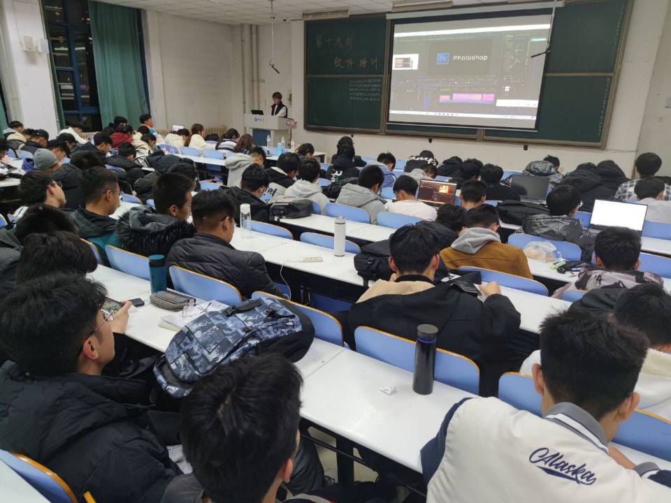 在主持人简单介绍后,培训正式拉开帷幕。本次培训通过讲解与现场操作演示相结合的形式详细的向大家介绍了Ps、Pr、Html的使用方法。会议伊始,讲解员王志恒上台进行现场Ps展示,边操作边教给同学们如何进行图片的剪切、修饰、去水印,并对Ps使用中可能遇到的问题一一解决。台下同学认真听讲并做笔记。随后讲解员朱财卉上台操作Pr进行演示讲解,她分别从如何设置软件,如何剪辑视频、调解,如何设置视频长度和分辨率对Pr进行详细介绍。并对视频调色、滤镜以及添加效果等方面的操作做了具体的说明。讲解员巧妙地使用不同的调色及滤镜让同一个视频呈现出截然不同的效果,这使得台下听众不禁赞叹Pr的神奇魅力。台下响起热烈的掌声,现场气氛积极活跃。接着讲解员张建启上台展示Html的操作方法,他在台上认真敲写代码搭建网站格式的同时也在详细的为同学们讲解操作缘由,最终呈现的网页效果令同学们赞不绝口。最后,主持人上台总结并表示:希望通过此次活动同学们能够学会如何使用Ps、Pr、Html,并运用到今后的学习生活中,取得更大的收获。