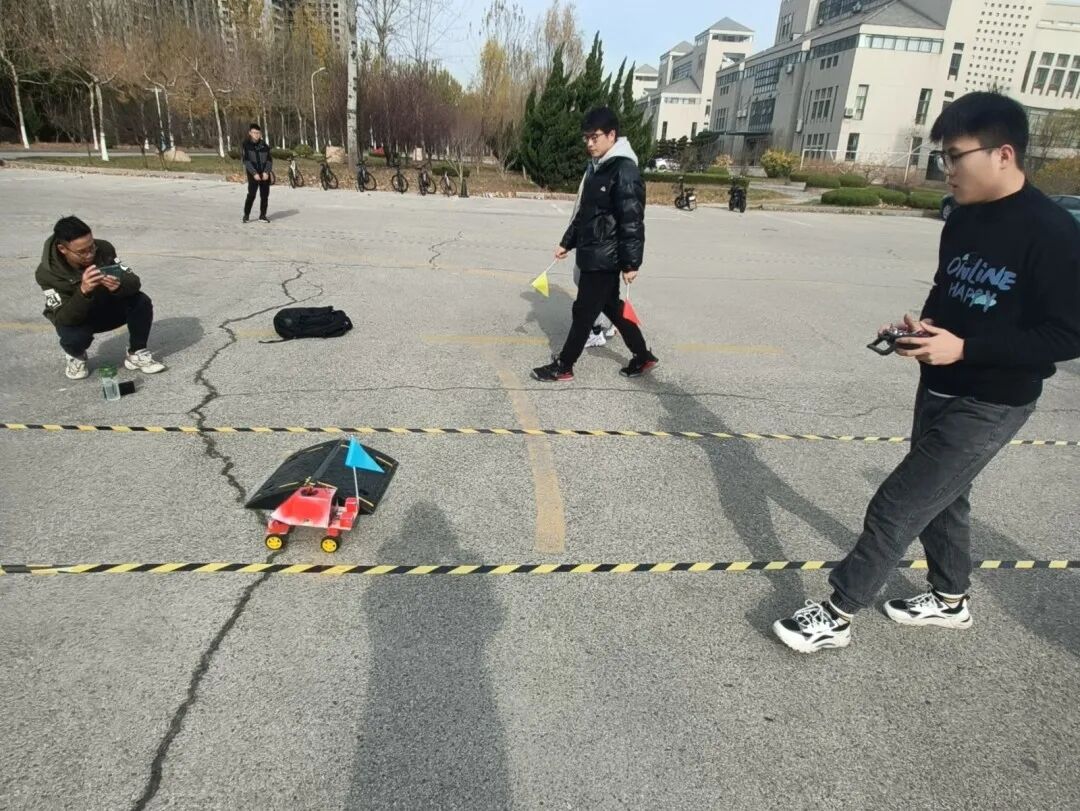 活动伊始,比赛场地已是人声鼎沸,参赛的21支队伍在此集结,操作手们都摩拳擦掌,蓄势待发。比赛前有一番试车环节,随后比赛正式进行。随着一声令下,第一支队伍已然踏上赛程,操作手操作着自己队伍制作的赛车,爬坡、转弯、S型弯道以及最后的直线冲刺,结束自己的第一轮征程。参赛的队伍都很优秀,难分伯仲。人群中时不时爆发出惊呼“这辆车刚才一个漂移没压线过弯”“那辆车冲刺速度几乎要起飞了”。由于第一次进行操作比赛,操作手难免会有失误,几只队伍的车因为速度太快而发生了翻车事故。甚至一辆车刚起步,轮子就掉了一个,但他们的队员们没有放弃,迅速地修整好继续出发,让我们深深地感受到竞技的魅力。在东阳下,随着一辆辆赛车冲过终点线,比赛也逐渐接近尾声。在经过最终的成绩计算后,本次车模大赛的冠军由“烟大附属幼儿园”队获得,“风行者”队和“雷速登梦之队”队获得二等奖,“510洲际导弹”队、“计蒙”队和“ 变成光,守护最好的魏淑芬”队获得比赛三等奖。活动最后,全体活动参与者共同合影。至此,第一届汽车模型竞速大赛落下帷幕。