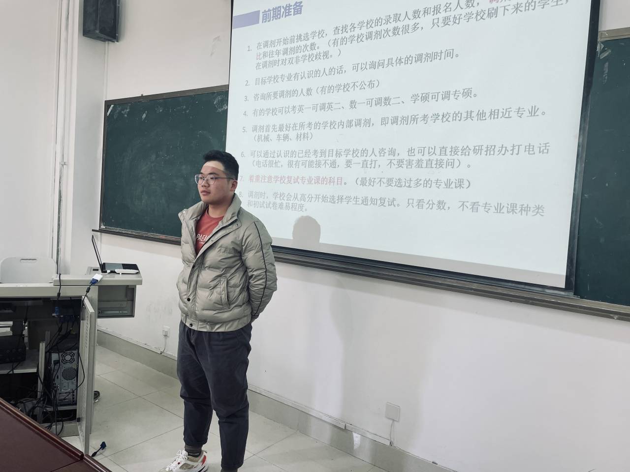 会中,六名学长分别结合自身考研报考经历,仔细详细地同在座同学讲解了报考的注意问题和切行可用的方法,包括复试前的准备、心态的调整、目标的确立等。以耿祥为例,作为beat365官网2021级研究生,他向在座的各位研究生建议:“行百里者半九十,复试之前的准备工作尤为重要,切不可松懈;听听过来人的建议,作为已经进入研究生行列的师兄师姐是值得引经据典的好地方。”同时,他还点出不要随波逐流,考研是一场一个人的战斗,要把握住自己的节奏,不要盲目跟随别人的节奏,尽人事,知天命。其中,他还向大家推荐了有助于大家进行调剂复试的几款App,并且再次提醒大家要放平心态,稳中求胜。随后,高建通学长分享了自己的心得体会和技巧方法。他将一些报考和复试各个阶段的细节问题一一罗列,重点强调了在座的同学应注意不要选择过多的专业课,不懂就去咨询。关于调剂的问题,高建通学长将调剂时各阶段的注意问题以及细节问题做了详细地说明,这无疑为在座的预备复试的学生打了一针镇定剂。接着,其他的几位学长也依次上台为大家进行经验的分享以及方法的传授。最后,主持人何彤宣布结束了本次交流会。