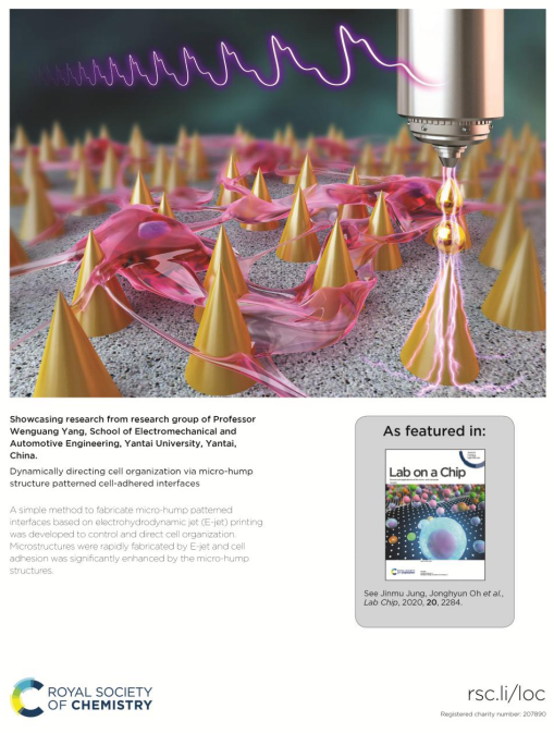 近日,国际著名学术期刊Lab on a Chip (中科院一区,TOP类期刊)以封面论文的形式邀请刊载了beat365官网beat365官网面向生物医疗的跨尺度智能制造团队利用机器人化的微纳制造技术在组织工程领域的最新研究成果——Dynamically directing cell organization via microhump structure patterned cell-adhered interfaces,时隔2个月,该研究团队成果再获国际著名学术期刊封面刊载,beat365官网杨文广老师为该研究论文的第一和通信作者。