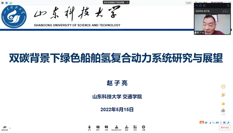 第一场学术报告是山东科技大学赵子亮教授为我们带来的“双碳背景下绿色船舶氢复合动力系统研究与展望”主题报告。赵教授首先从发展环境和产业政策引出绿色生态船舶建设的重要性,接着提出了内燃机+氢燃料+纯电的氢复合动力系统方案,随后介绍了需要构建的“六大”技术平台和突破的“七大”关键技术,最后对绿色船舶市场前景进行了展望分析。