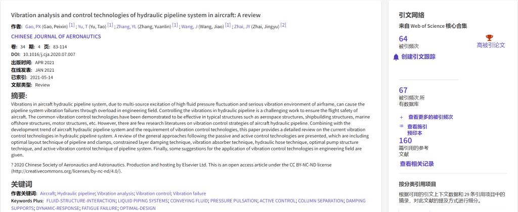 根据Essential Science Indicators(简称ESI)2023年7月公布的最新统计结果,我院“高端装备动态设计与先进制造技术”学科团队青年教师高培鑫发表于《Chinese Journal of Aeronautics》的论文《Vibration analysis and control technologies of hydraulic pipeline system in aircraft: A review》入选ESI高被引论文,这也是我院本年度第二篇高被引论文。