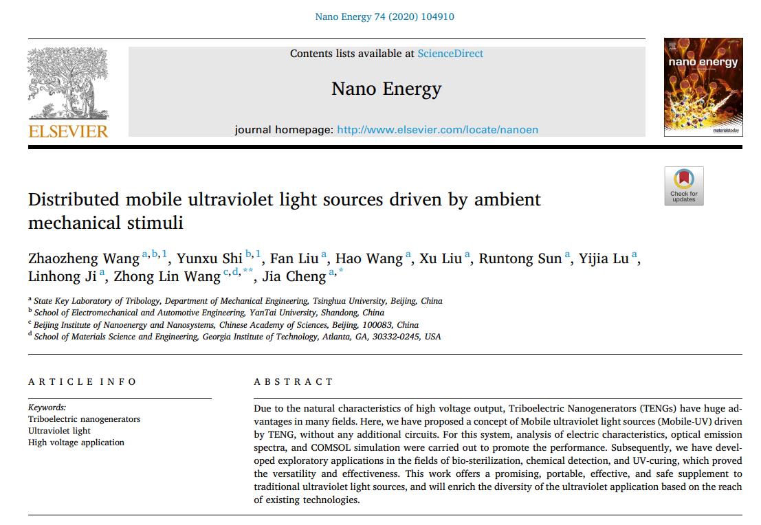 202054日,我院石运序副教授课题组与清华大学季林红教授课题组合作在国际能源顶级期刊Nano EnergyIF=15.548JCR一区,TOP期刊)上在线发表题为“Distributed mobile ultraviolet light sources driven by ambient mechanical stimuli”的论文,我院硕士生王昭政和石运序副教授为论文第一作者,清华大学机械系程嘉副研究员和中国科学院外籍院士、佐治亚理工学院终身教授王中林院士为论文通讯作者。
