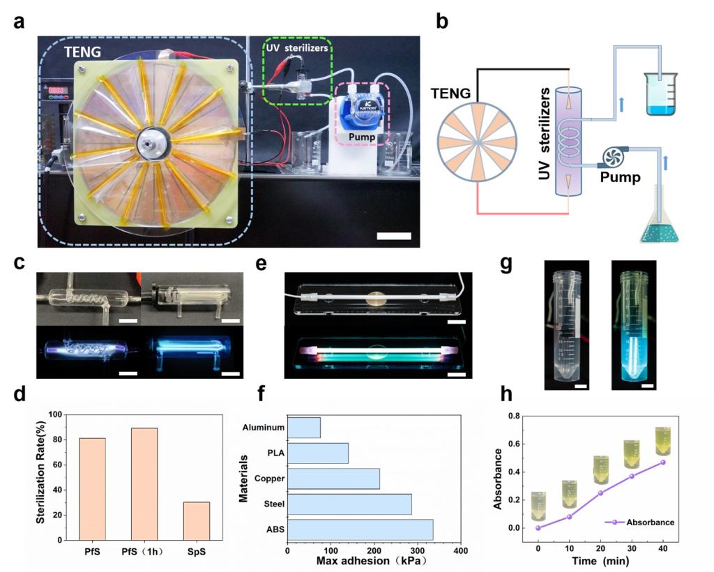 2. 分布式移动紫外光源在生物杀菌、化学检测和紫外线固化中的应用.a)水杀菌系统(b)水杀菌流程图(c)水杀菌反应器(d)水杀菌结果(e)光固化反应装置(f)光固化结果(g)光化学反应装置(h)光化学反应结果