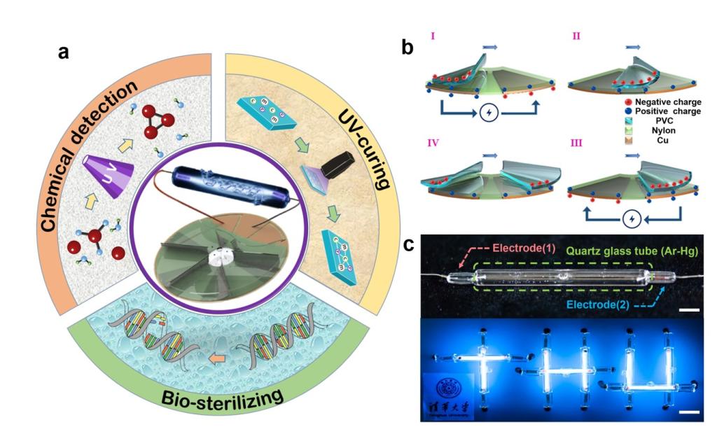 1. 环境机械刺激驱动的分布式移动紫外光源(a)分布式移动紫外光源概念图 (b)摩擦纳米发电机工作原理图 (c)紫外线发生器实物及图案化